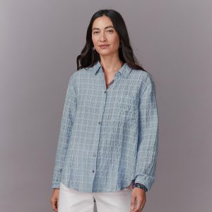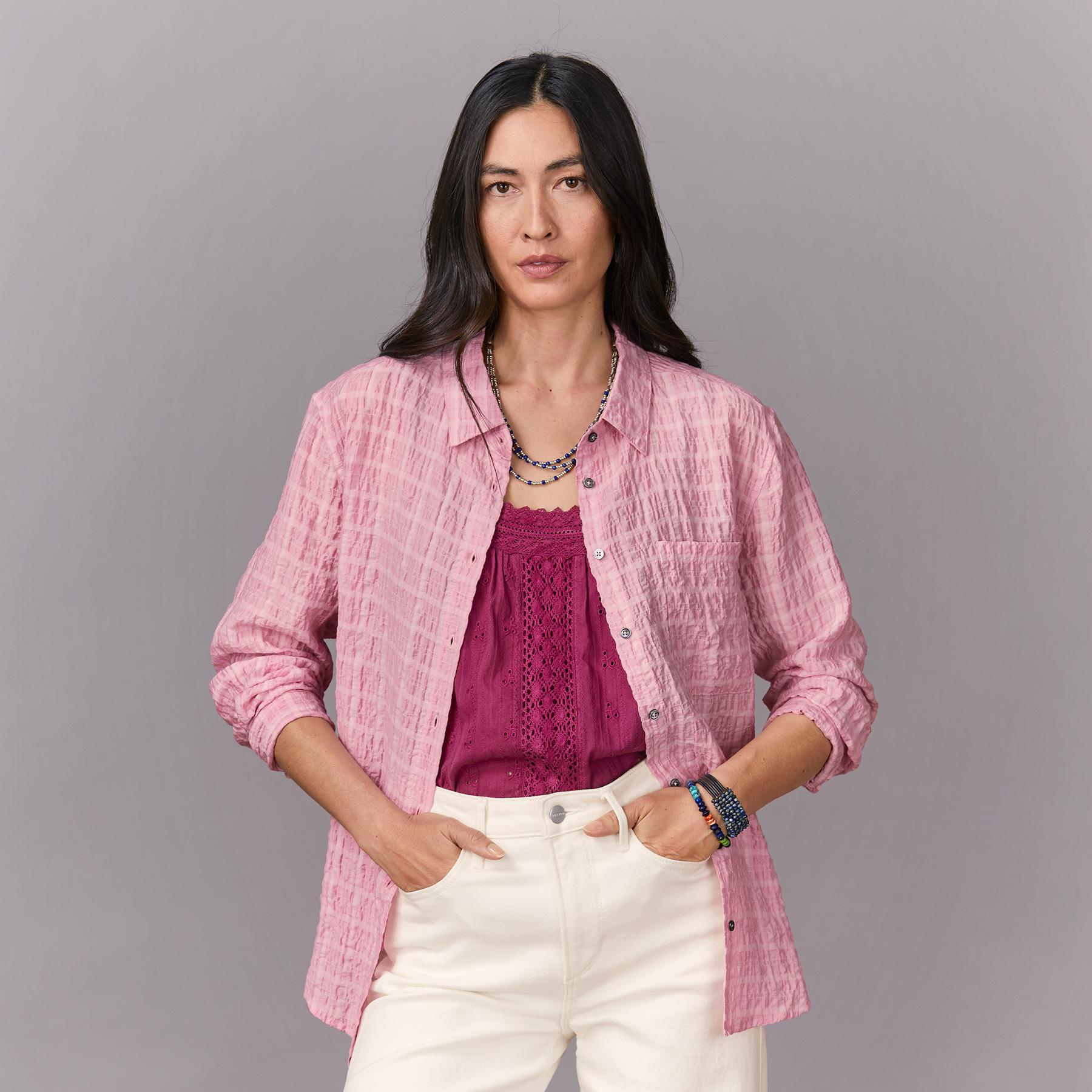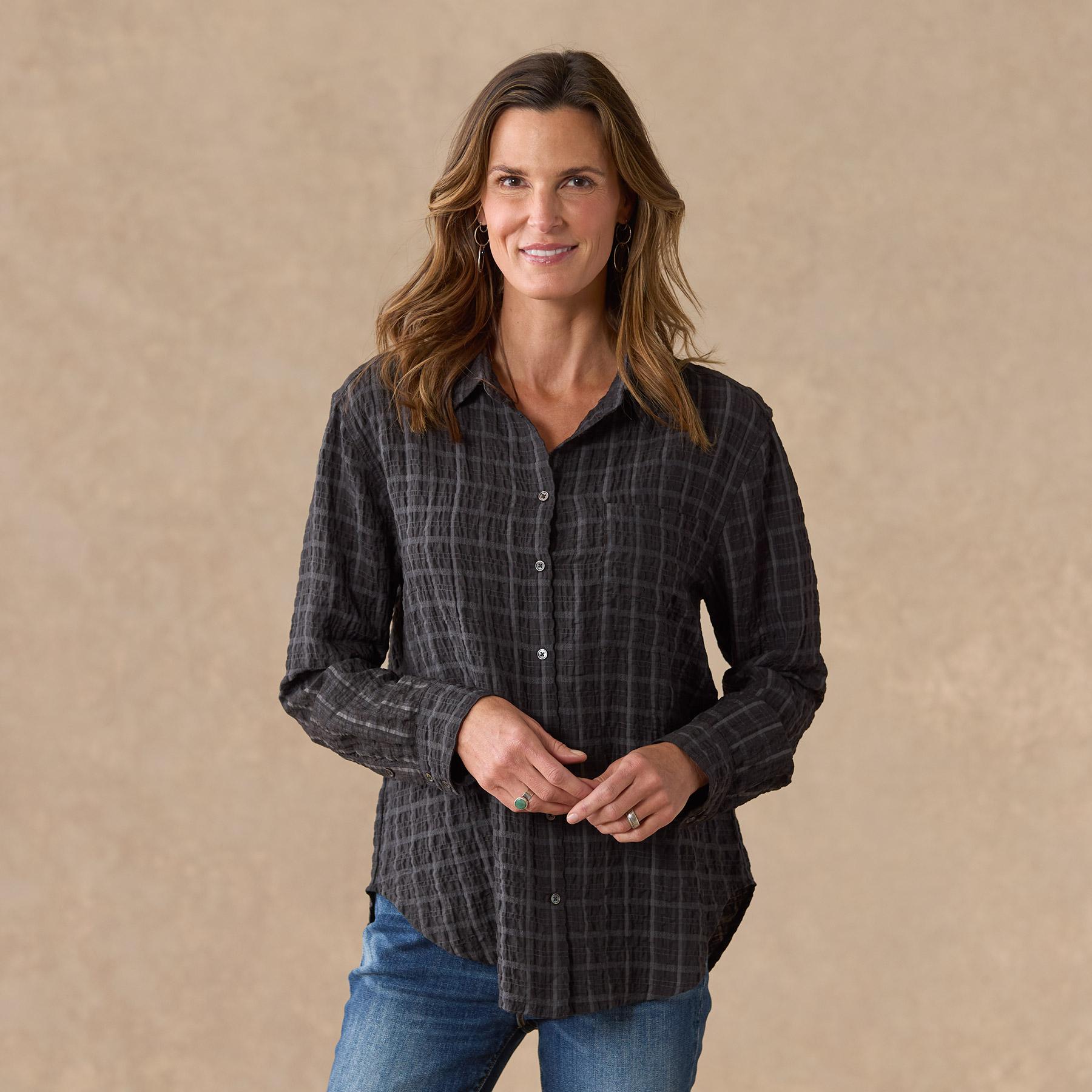 With a crinkle texture. front pocket and roll-up sleeves. this button-up shirt provides timeless comfort and style. Tencel/Rayon/Nylon. Machine Wash. Imported. Sizes XS (0-2). S (4-6). M (8-10). L (12-14). XL (16-18). XXL (20-22). Approx. 27.25l.