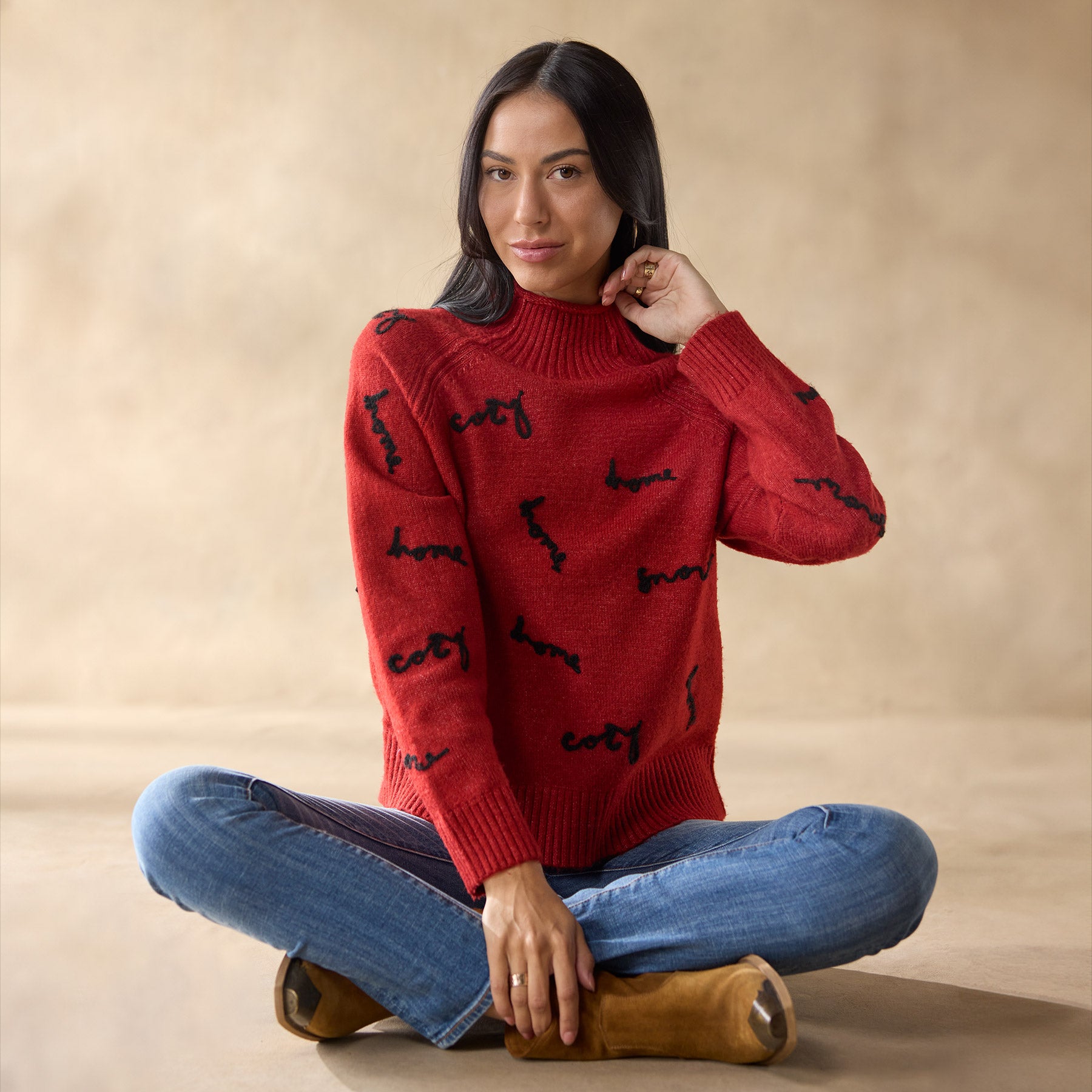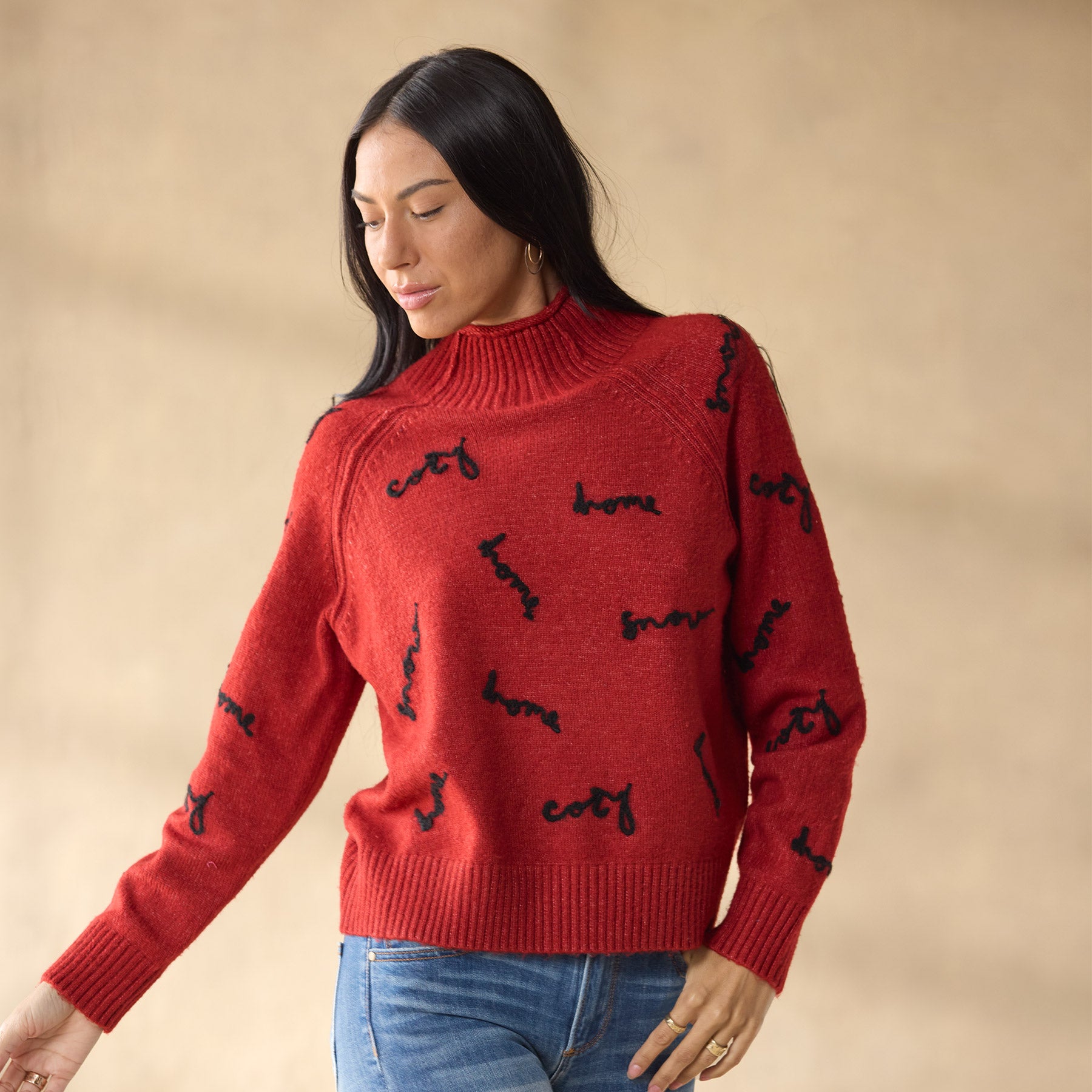 Our cozy sweater features the machine-embroidered sentiments cozy. home and snow. An allover rib with mock neck. rib trim. jersey roll neckline and exposed seaming at raglan sleeves. Acrylic/nylon. Hand wash. Imported. Exclusive. Sizes XS (0–2). S (4–6). M (8–10). L (12–14). XL (16–18). XXL (20–22). Approx. 23l.