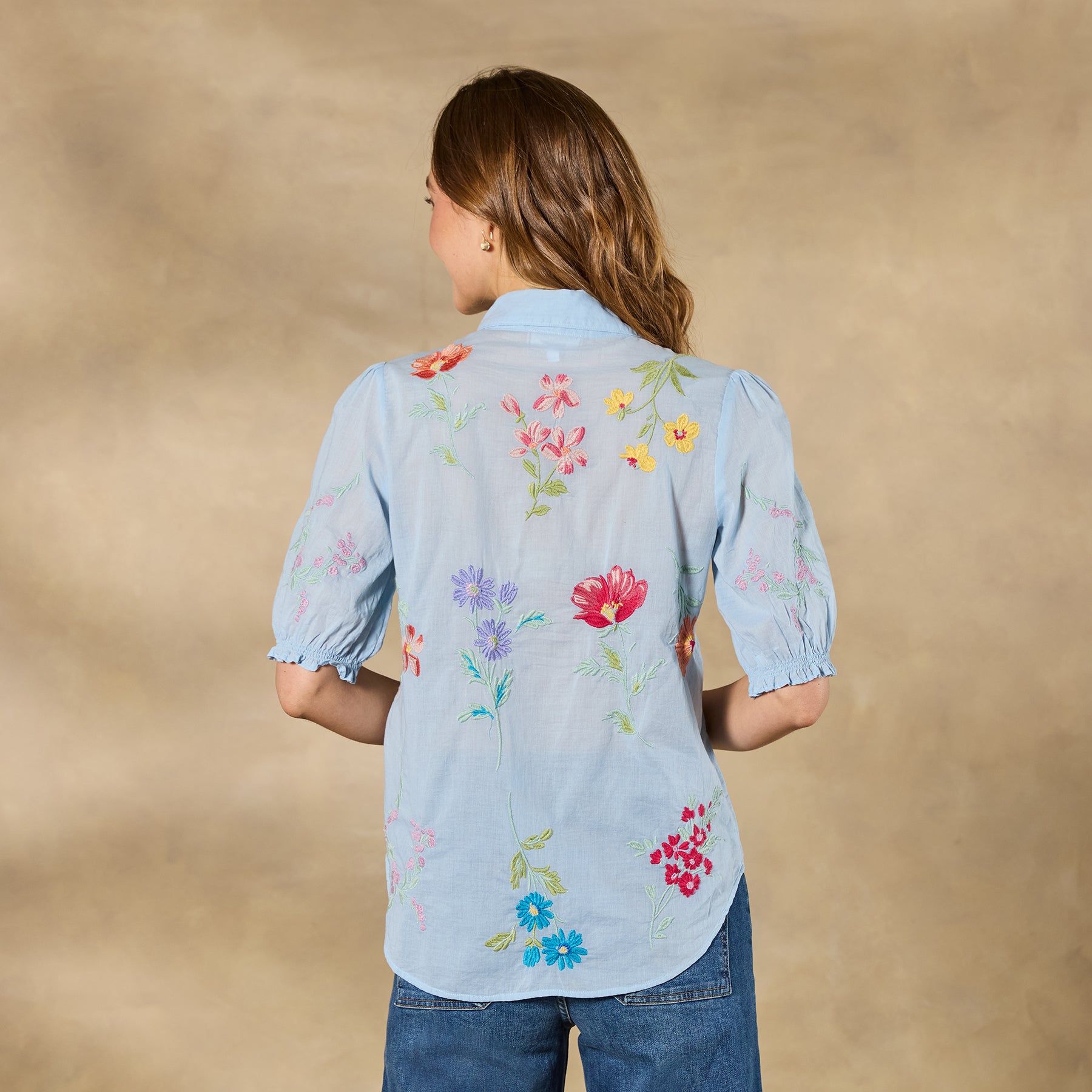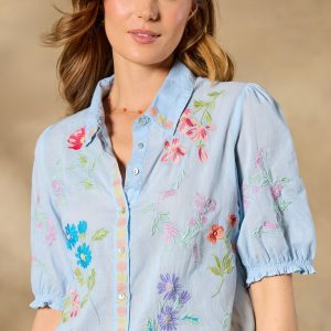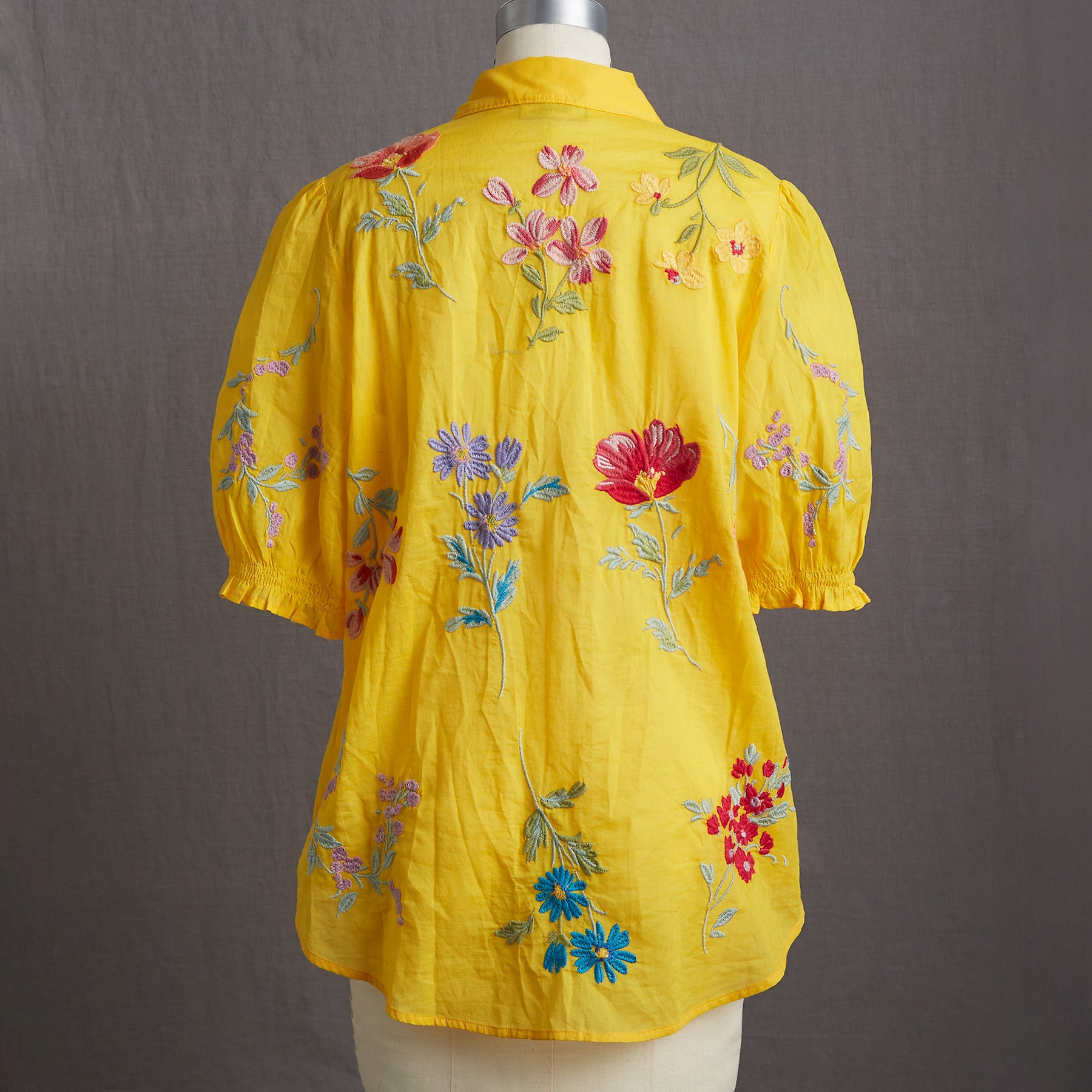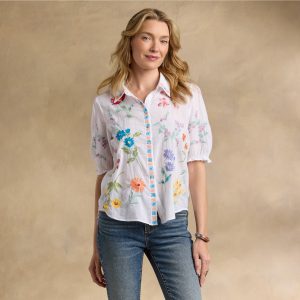 This gorgeous. collared. button-front shirt just exudes happiness with its rich color. allover embroidery. and short blouson sleeves with elastic cuffs and tiny ruffles. Shirttail hem. Cotton. Machine wash. Imported. Sizes XS (4). S (6). M (8–10). L (12). XL (14). XXL (16). Approx. 25.5l.