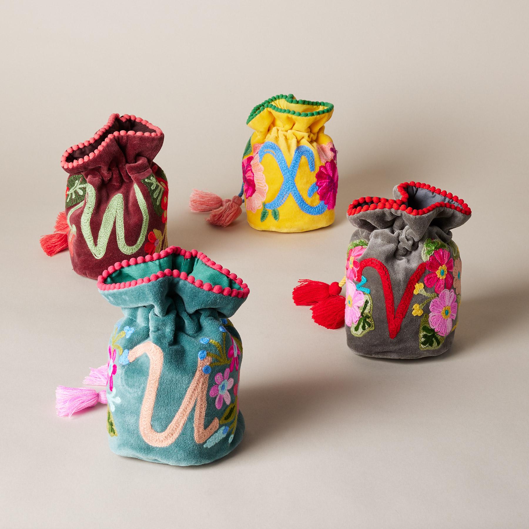 Lavishly embroidered. our personalized velvet pouches brighten every day as they keep jewelry protected and organized. Handmade from cotton. with tasseled drawstrings. mini pompom trim and inner slip pockets for rings. studs and other small treasures. Handmade. Exclusive. 6w x 7h.
